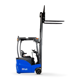 This electric forklift is a compact and maneuverable three-wheel front loader for narrow aisles, trucks and containers. Its electric motor is quiet and emission-free.