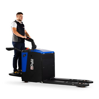 Unser elektrischer Mitfahrhubwagen RUN mit Standplattform ist ein leistungsstarkes Pro-Modell für den intensiven, täglichen Einsatz im Innenbereich.
